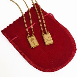 O escapulário é composto de 2 placas de 0,9x1,3cm e corrente total de 60cm.