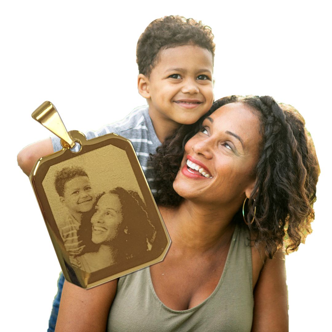 Este pingente folheado a ouro personalizado com foto é uma joia criada para eternizar momentos únicos e cheios de significado. Com 1,4x1,8cm, possui tamanho ideal para uso diário, mantendo elegância, leveza e presença. A personalização é feita por fotogravação de alta precisão, uma técnica que transfere a imagem diretamente para a superfície do pingente em baixo relevo direto no metal, sem uso de cores, garantindo riqueza de detalhes, durabilidade e um acabamento sofisticado.